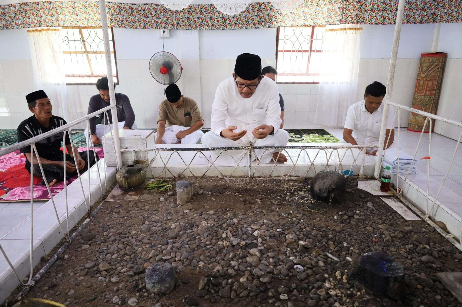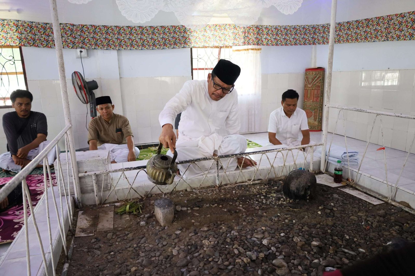 Sarung telah disiapkan oleh pengelola makam. Selanjutnya setelah memasang sarung berwarna putih, Azhar diantar ke sumur dekat makam.