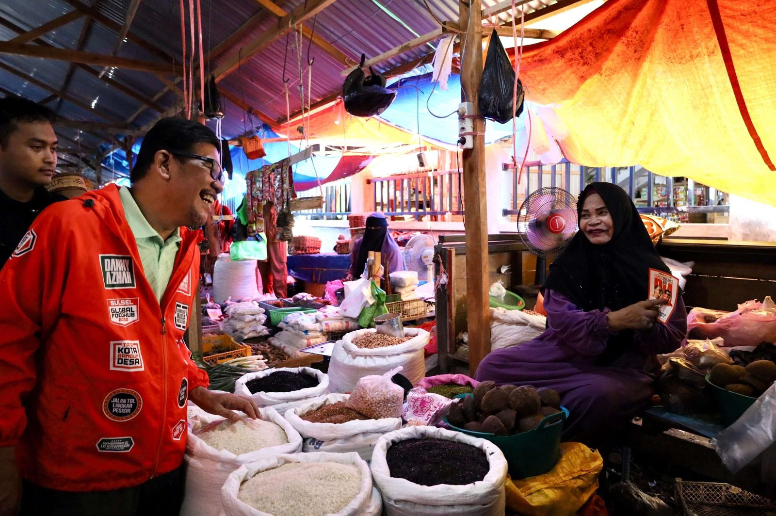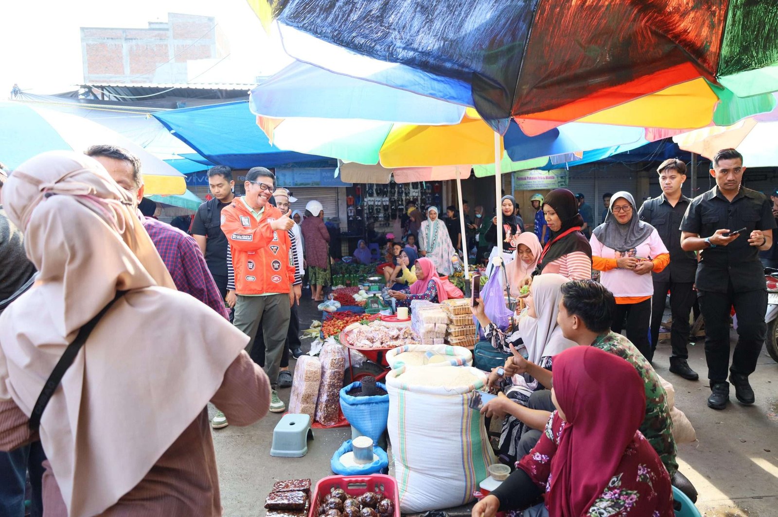 Azhar berjalan kaki dan berbaur dengan masyarakat dan pedagang, mendengarkan aspirasi terkait kondisi perekonomian dan infratruktur pasar.