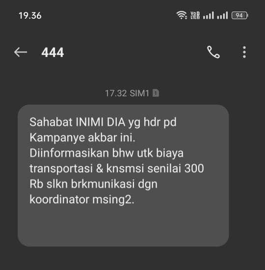 “Sahabat INIMI DIA yg hadir pd Kampanye akbar ini. Diinformasikan bhw utk biaya transportasi & knsumsi senilai 300 RB slkn berkoordinasi dgn koordinator msing2,” demikian bunyi SMS blast yang beredar.